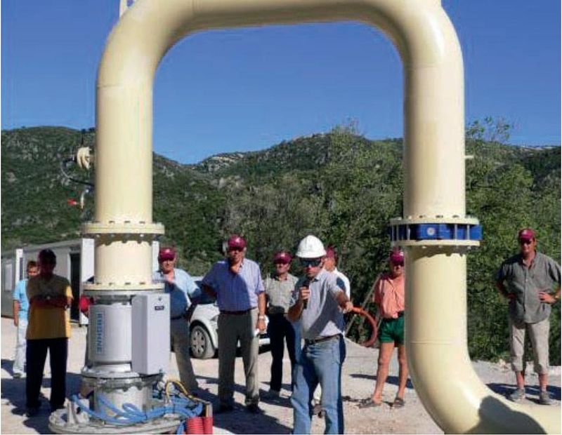 During early pumping times (Fig. a), conduit linear flow (conduit or wellbore storage effect) is characterized by a straight line with a slope n = 1 on the diagnostic plot. After a transition flow period, the system may or may not exhibit a bi-linear flow period (Fig. b), indicated by a one-fourth-slope straight line that lasts as long as the conduit boundaries do not affect the flow pattern. As time increases, the flow in the matrix becomes one-dimensional (horizontal, parallel and perpendicular to the conduit) as illustrated on Figure c. On a diagnostic plot, the slope of the derivative curve is n = 0.5. As pumping continues, the flow pattern can change from parallel flow to pseudo-radial flow (Fig. d). During this period, the pumped water originates from farther away and the local effect of the finite-length conduit tends to disappear. The drawdown curve tends to the Jacob straight line with a slope n = 0 of the derivative at late times, but this would arise only if the duration of the pumping test is very long. This four-period flow-pattern geometry makes it impossible to interpret such drawdown curves with classical techniques. The corresponding typical drawdown and derivative curves (diagnostic plot) are illustrated on Fig. e.